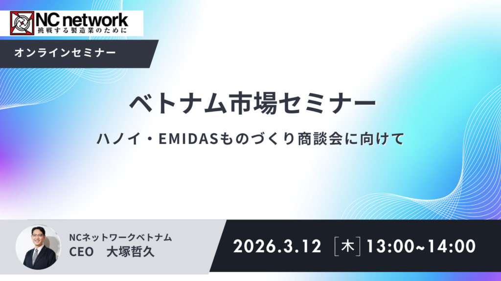 生産移管・分散の流れは依然活発で、日系企業のみならず多国籍メーカーが、ベトナムを製造・調達の重要拠点として位置づけています。EMIDASものづくり商談会には、ベトナム国内調達を狙う企業、ASEAN展開を進める企業、現地パートナーを求める外資・現地企業が集結。単なる一国展示会ではなく、「ベトナムをハブに複数市場とつながる」国際商談の場です。出展企業の約7割を占める中小受託加工企業にとって、国内受注からASEAN展開の足がかりまで、複数の商談機会を一度に得られる点も大きな魅力。本ウェビナーでは、その活用ポイントを解説します